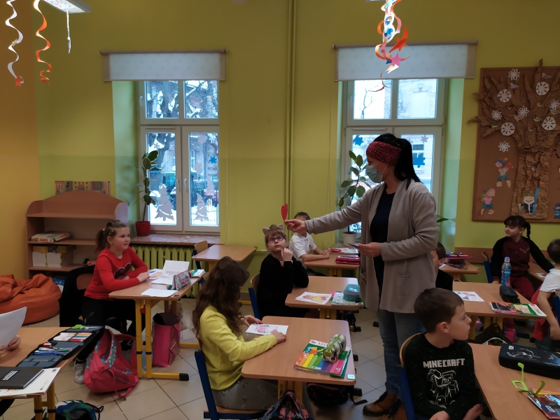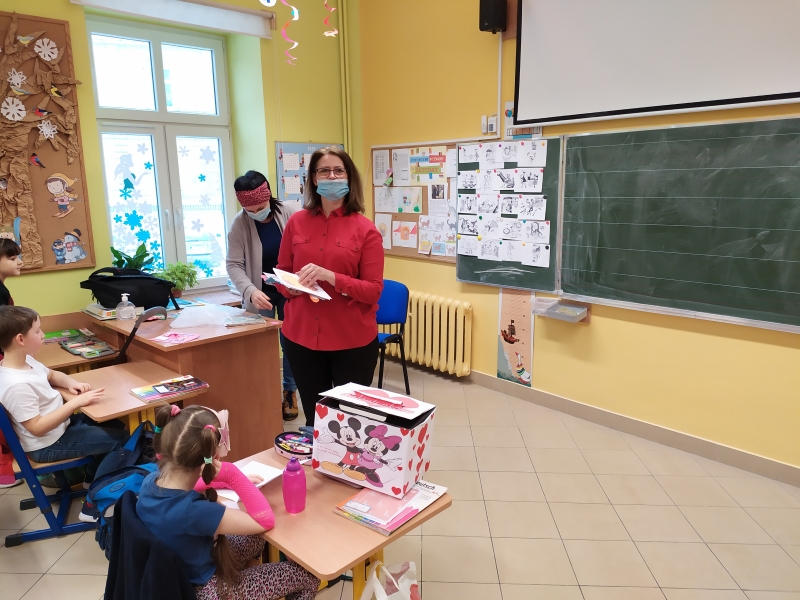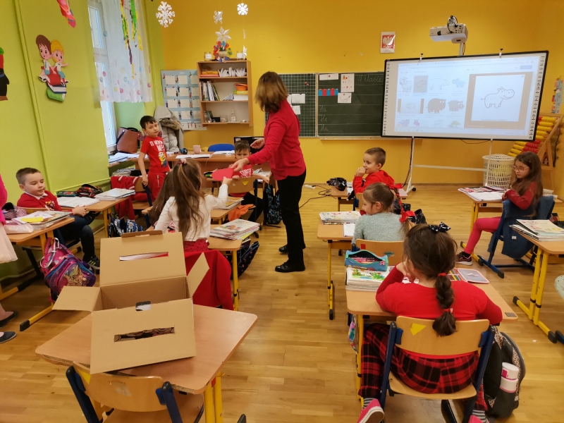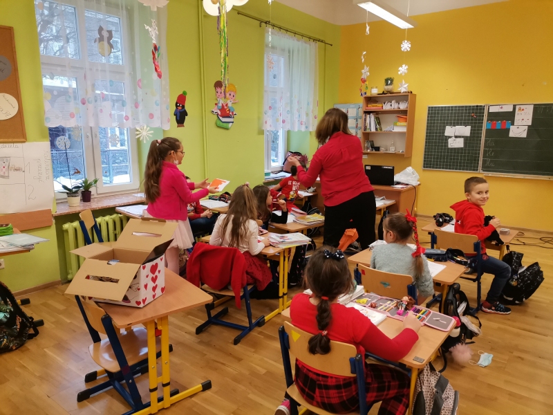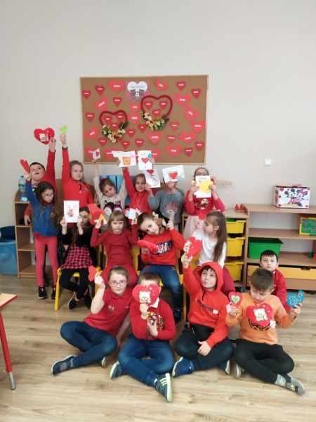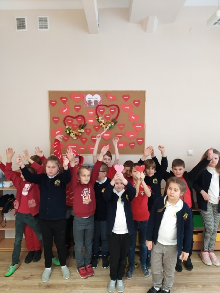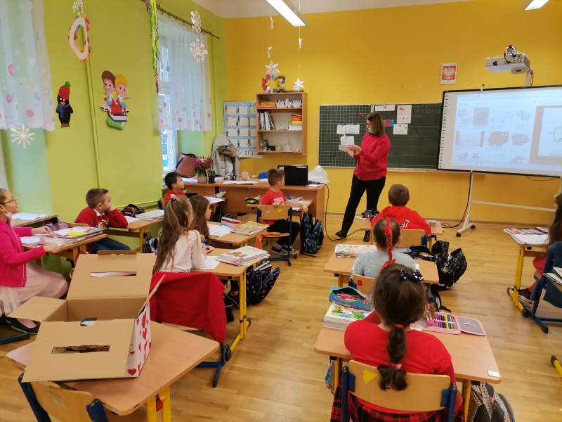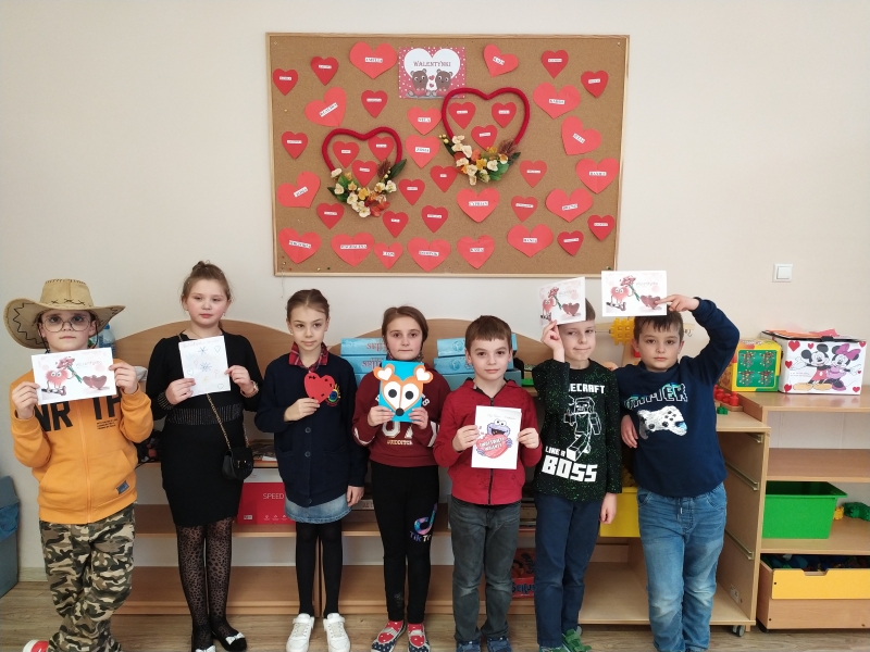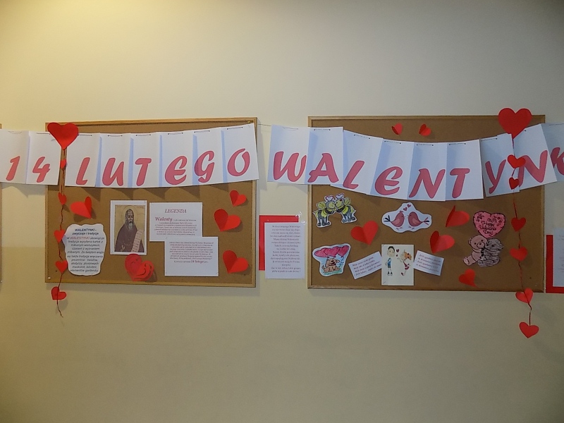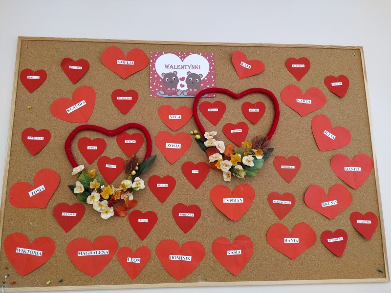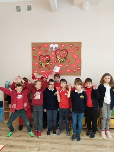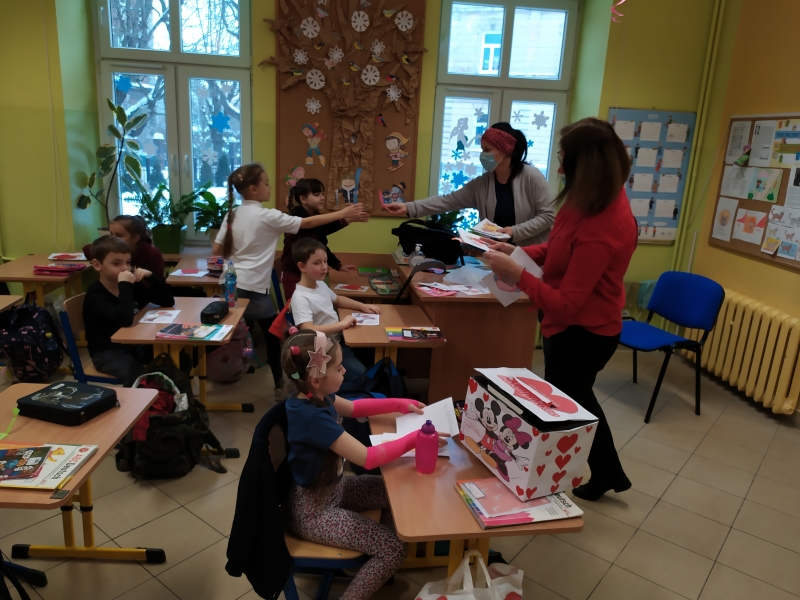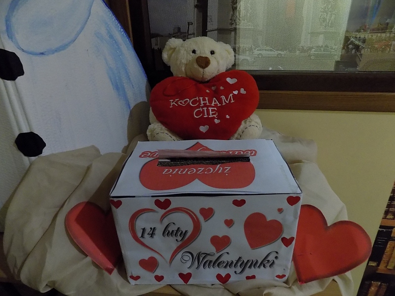 15 lutego w naszej szkole królował kolor czerwony, a to za sprawą walentynek. Na szkolnych gazetkach i świetlicy pojawiły się tematyczne dekoracje – wśród których przeważały ozdoby w kształcie serc. Poprzedniego tygodnia dzieci z zapartym tchem wycinały, kleiły, malowały, kolorowały i pisały życzenia dla swoich sympatii, najbliższych i przyjaciół. Każda walentynka wyrażała uczucia miłości, przywiązania oraz zawierała komplementy. Wszystkie trafiły do walentynkowej skrzynki pocztowej. W poniedziałek trafiły do rąk adresatów.