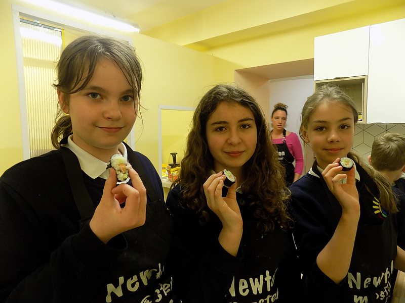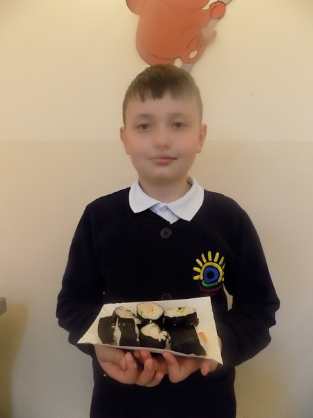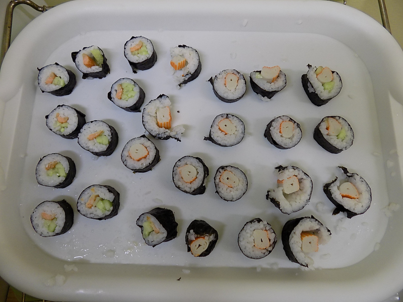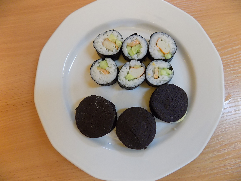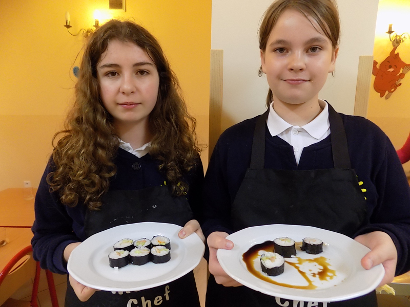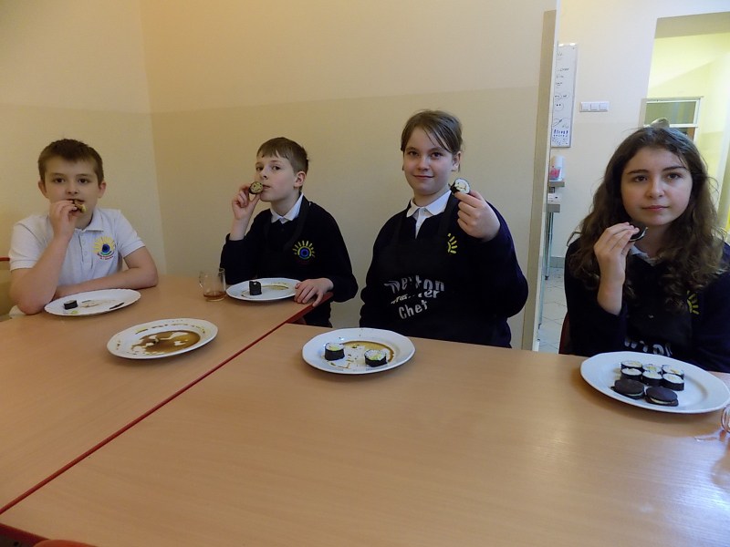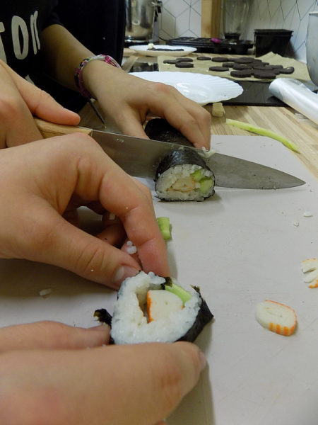 Ale to nie koniec kulinarnych przygód. Teraz będą inne wałki. Wałki z wodorostów nori. Zawijane własnoręcznie przez naszą dzielną brygadę. Z precyzją i cierpliwością. A w środku pyszny ryż, świeży ogórek i krab. Jedni zawijają, inni wyciskają.