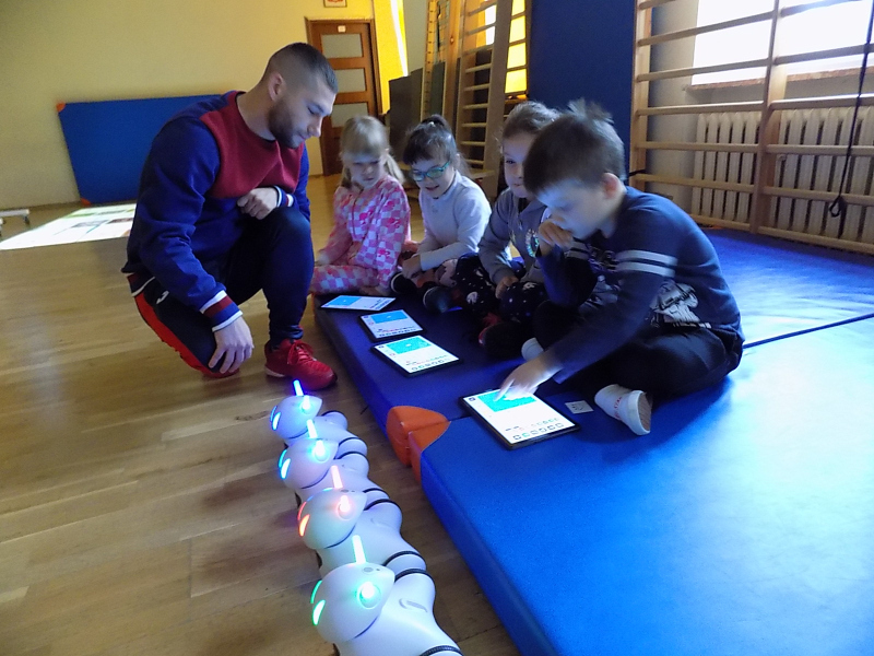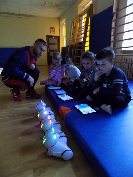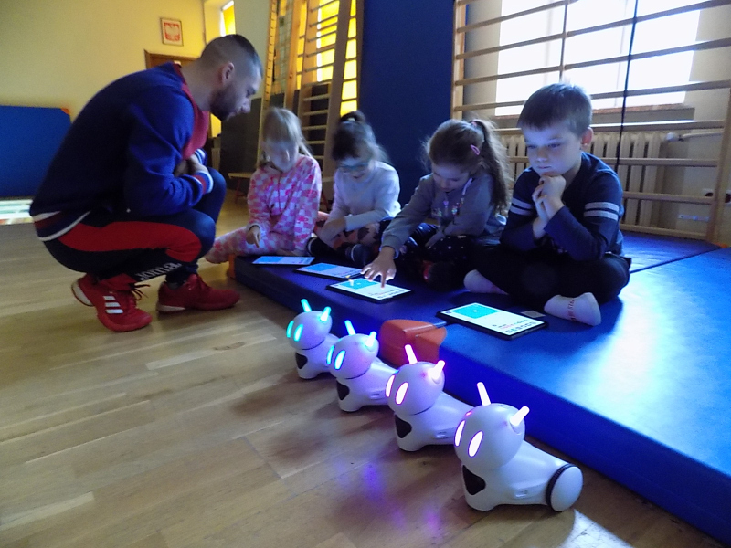 Później na naszej sali gimnastycznej czekały na nie przyjacielskie robotyczne pieski, które dzieci mogły programować przy pomocy tabletów.