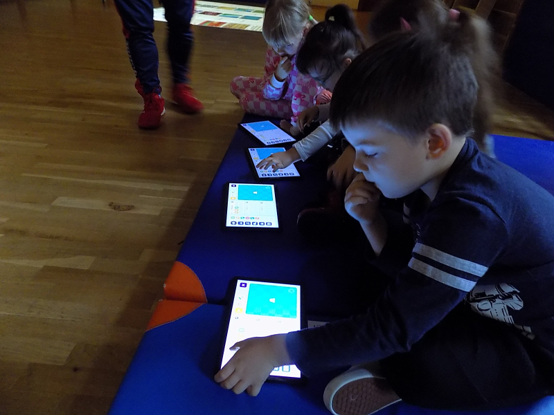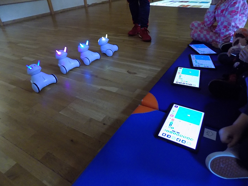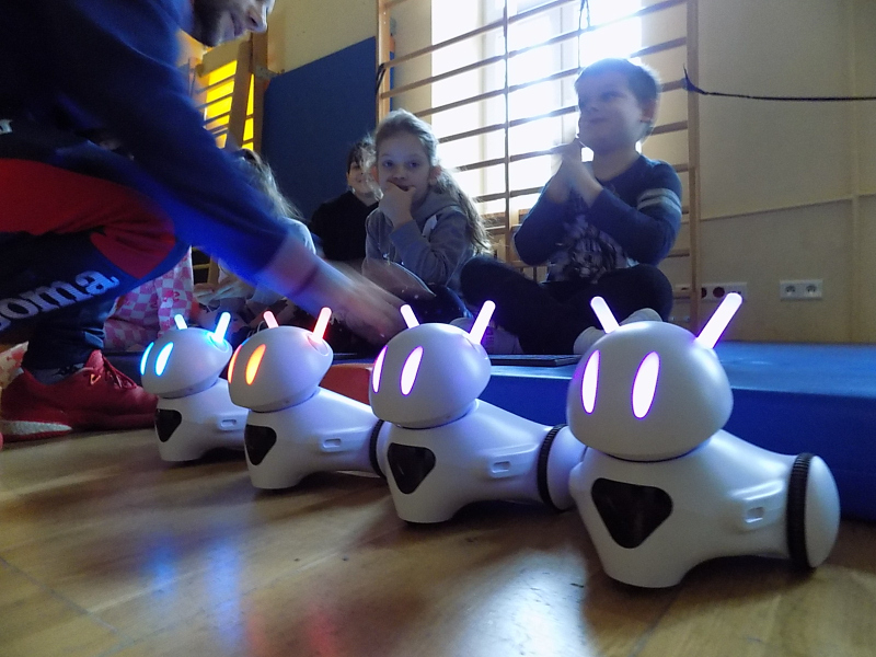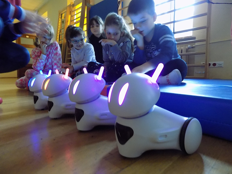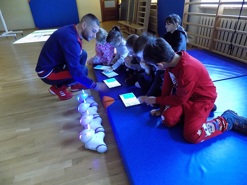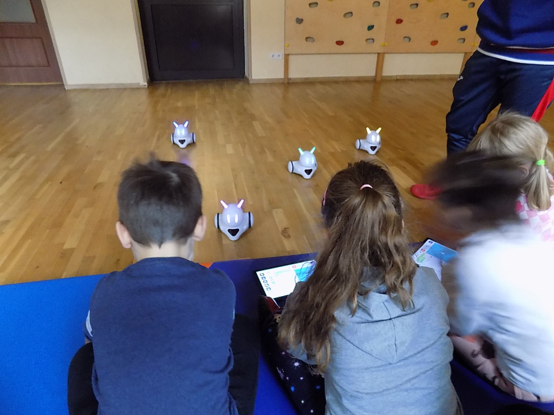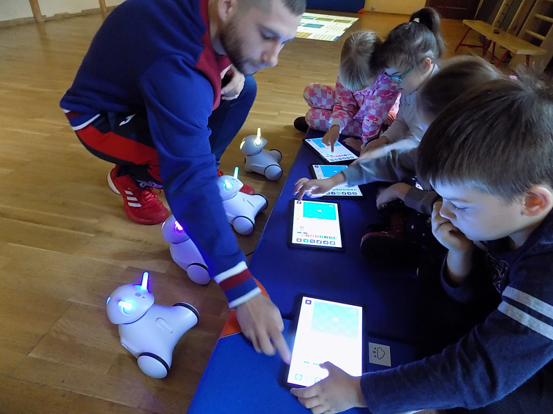 Później na naszej sali gimnastycznej czekały na nie przyjacielskie robotyczne pieski, które dzieci mogły programować przy pomocy tabletów.