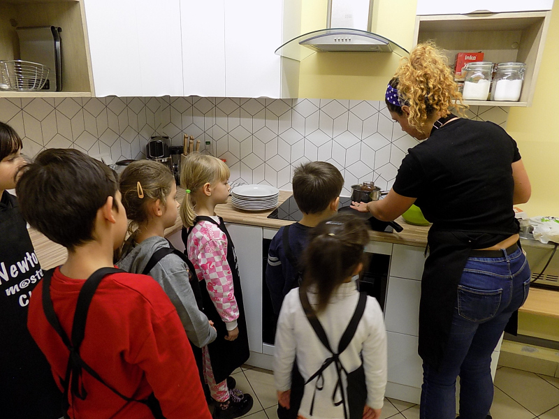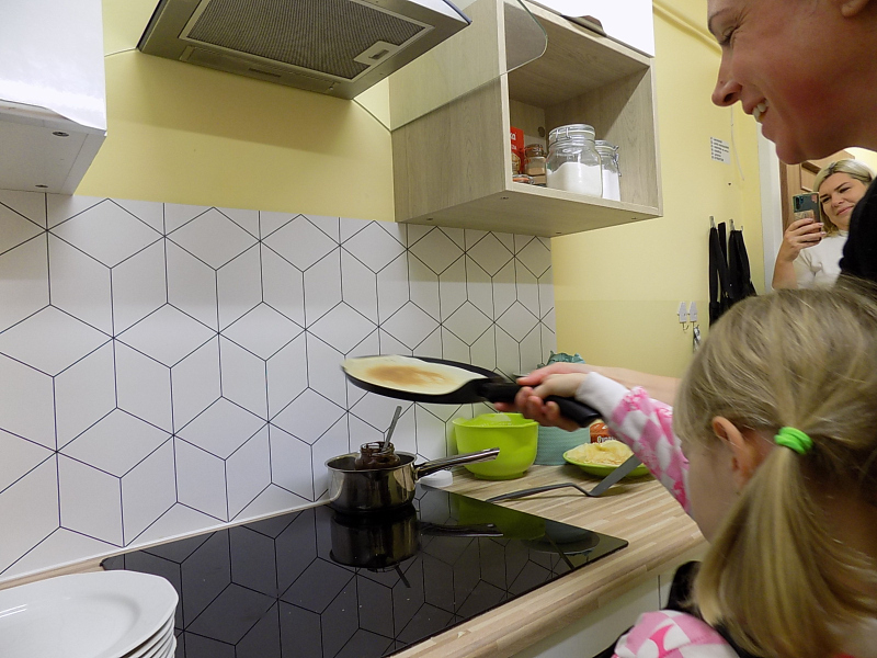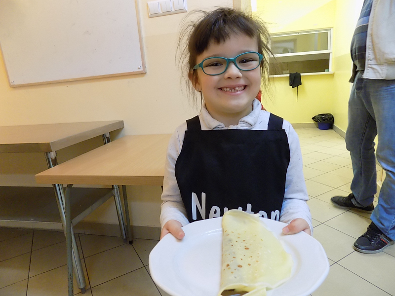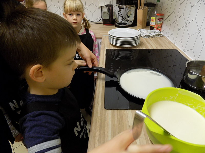 Przepyszny zapach, który roznosił się po całej szkole kazał nam podążyć do naszego szkolnego warsztatu kulinarnego, gdzie dzieci miały sposobność usmażyć pierwsze w życiu naleśniczki. Dodatek kremu orzechowego sprawił, że nasza kuchnia zamieniła się w siódme niebo.