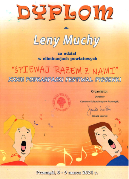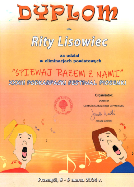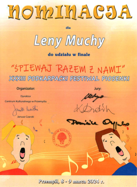 8 marca uczennice klasy 3a naszej szkoły: Lena Mucha i Rita Lisowiec wzięły udział w eliminacjach XXXIII Podkarpackiego Festiwalu Piosenki „Śpiewaj razem z nami”. Z wielką radością informujemy, że obie uczennice – nasze Szkolne Newtonki – zakwalifikowały się do przeglądu finałowego, który odbędzie się 5 kwietnia w Rzeszowie.