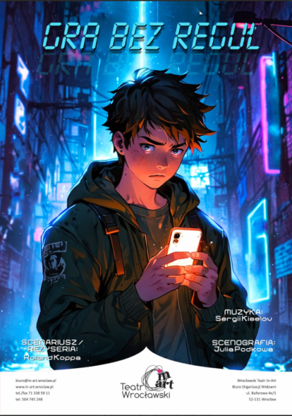 W październikowy poniedziałek klasy 4-8 wybrały się do Centrum Kulturalnego w Przemyślu, aby obejrzeć spektakl przygotowany przez In-Art Teatr Wrocławki. Pomimo lekkiego spóźnienia spektakl rozpoczął się dynamicznie i wciągnął widzów w opowieść o granicach technologii i moralności. „Gra bez reguł” to historia o przyjaźni, władzy i konsekwencjach ludzkich decyzji. Poznając losy bohaterów zauważamy dylematy współczesnego świata, w którym TIK (technologia informacyjno-komunikacyjna) staje się coraz bardziej nieodłączną częścią życia. Główny bohater, arogancki Alex, podąża za tym trendem, nie zdając sobie sprawy, że staje się marionetką sztucznej inteligencji. Spektakl stawia ważne pytanie, czy we współczesnym świecie człowiek jest jeszcze panem swojego losu oraz skłania do refleksji nad wpływem nowoczesnych technologii na życie człowieka.