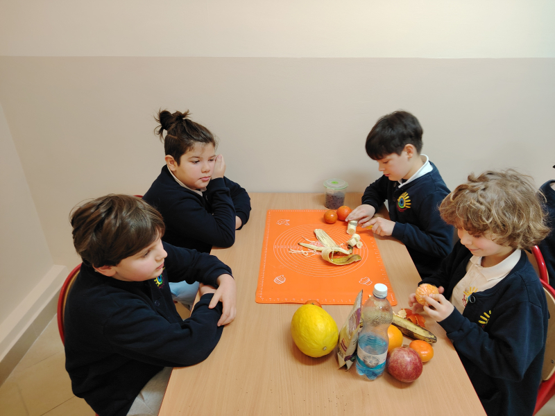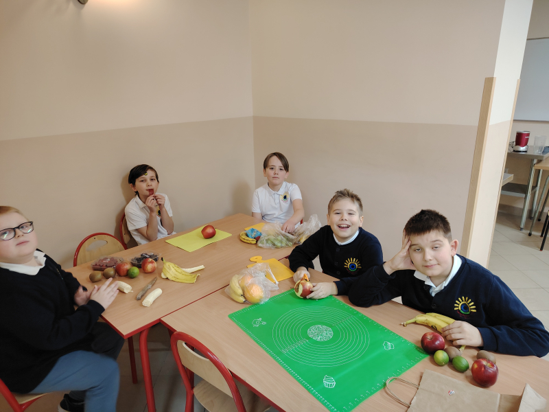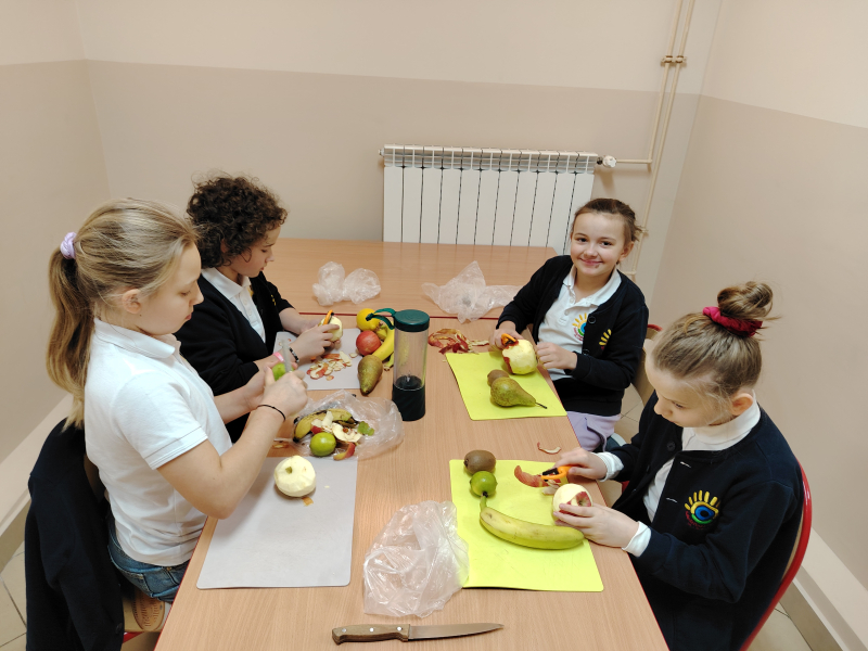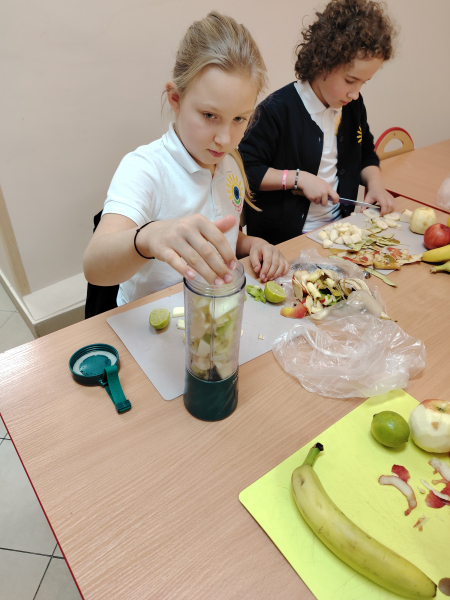Gdzie w kuchni ukryła się matematyka wiedzą uczniowie z klasy 3. Mianowicie: w ilości owoców, naczyń, sprzętów kuchennych, produktów spożywczych, kilogramach, gramach, dekagramach, litrach, długości obranej skórki jabłka itd. W ramach matematycznego projektu dzieci samodzielnie przygotowały owocowy koktajl, wykorzystując matematyczną  wiedzę. Od smacznej strony poznawały Królową Nauk.